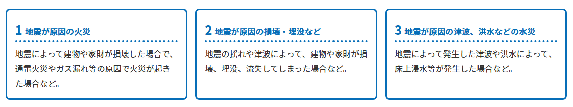 ※保険商品によっては、火災保険に地震特約がついているなど、地震由来の火災が火災保険の一部に組み込まれている形の保険商品もあります。