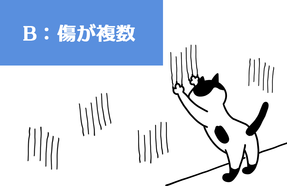 傷が一つの場合は、猫がつけた傷であっても防ぎようがない突発的に起きた損害と判断できますので、『その他偶然の事故(破損・汚損)』に該当します。