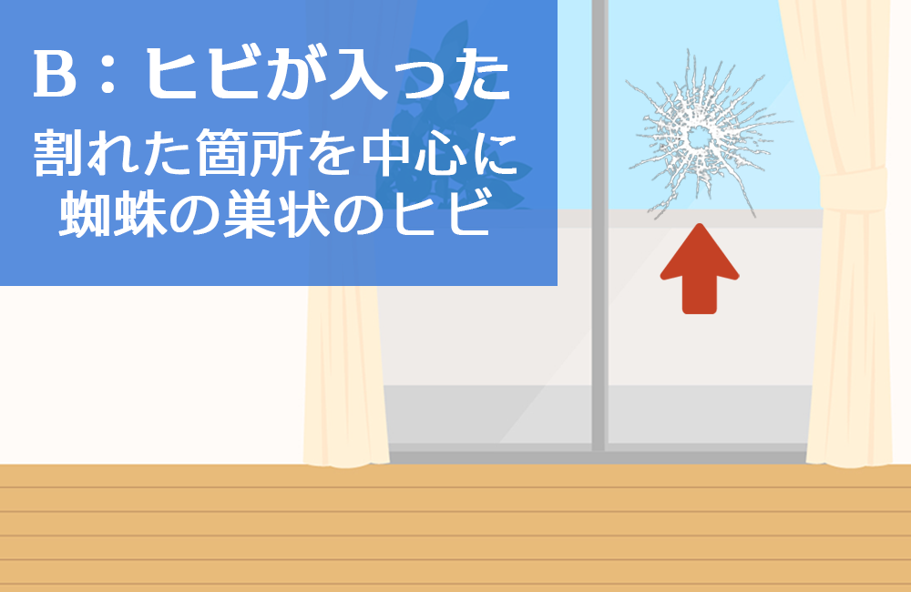 B:ヒビが入った(割れた箇所を中心に蜘蛛の巣状のヒビ)