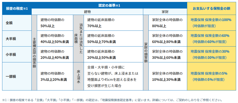 損害の程度は「全損・大半損・小半損・一部損」の4段階に区分され、それぞれ保険金の支払割合は概ね100%、60%、30%、5%と定められています。